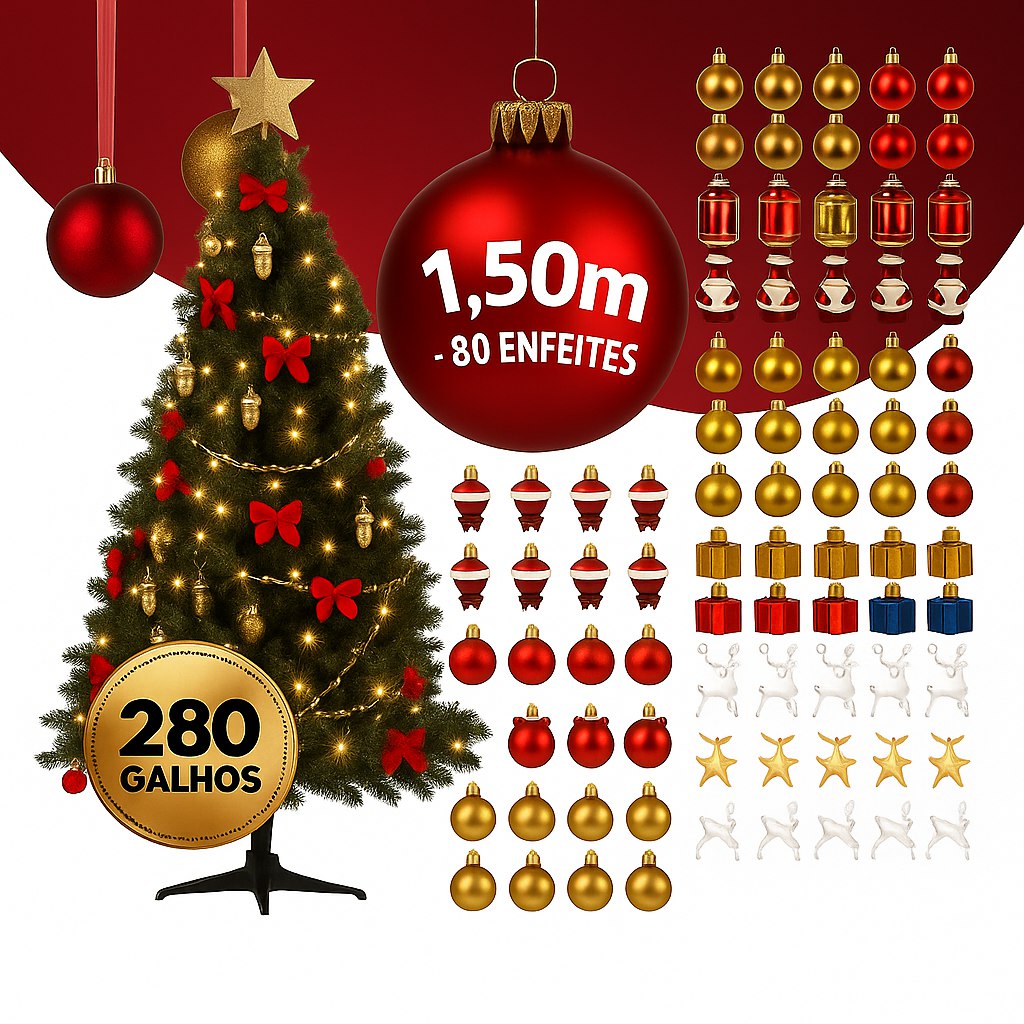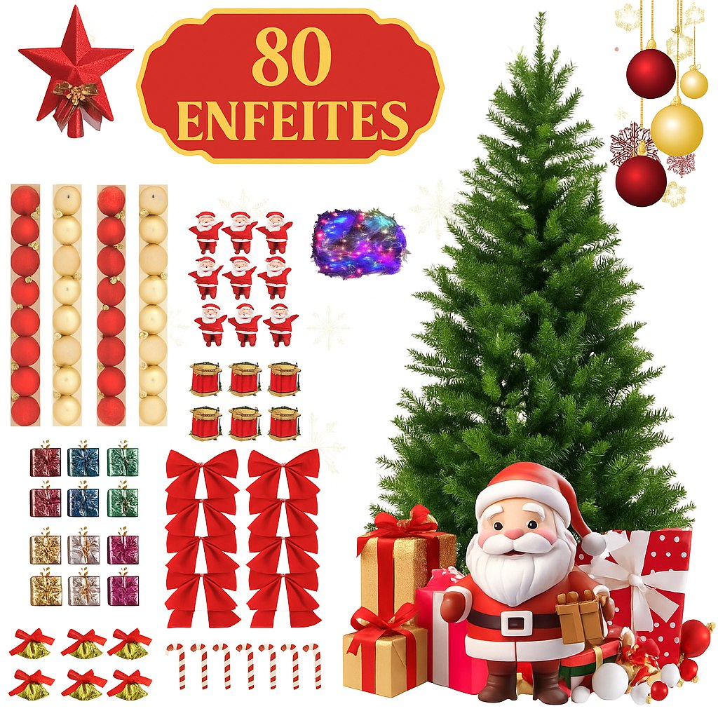 Árvore de Natal 180cm a 210CM com 80 Enfeites